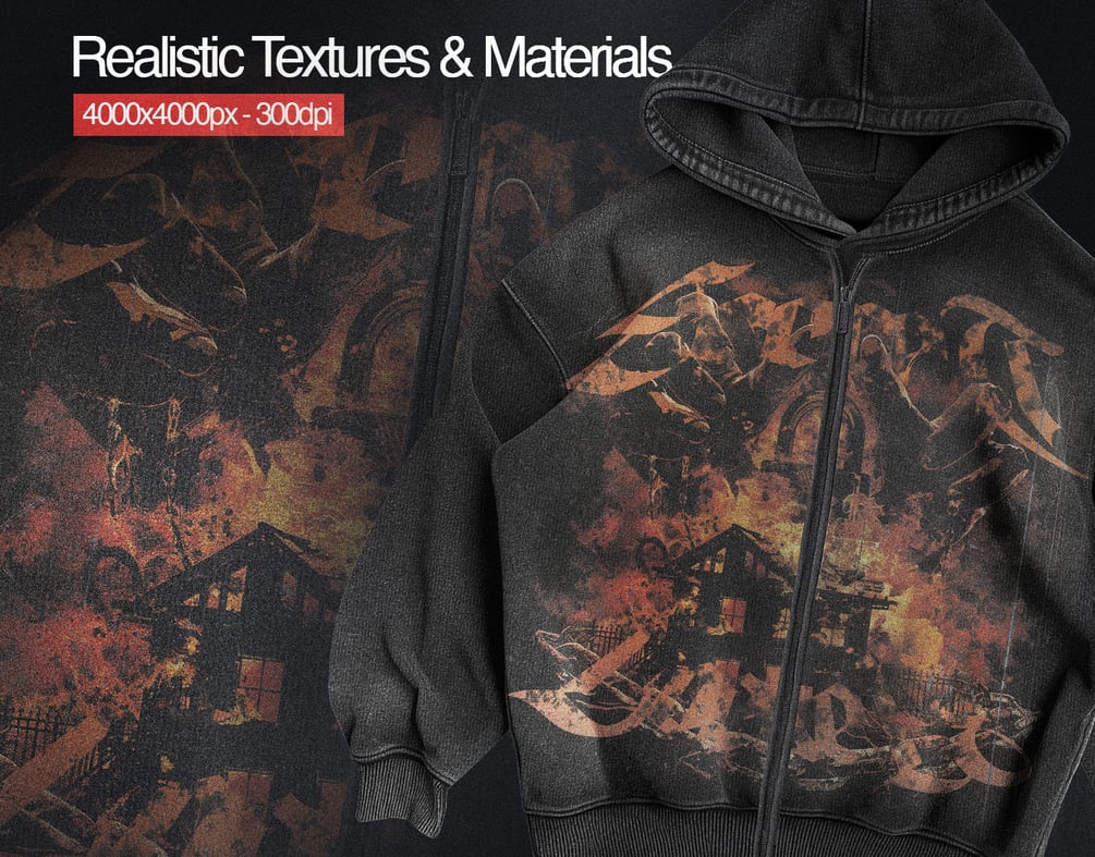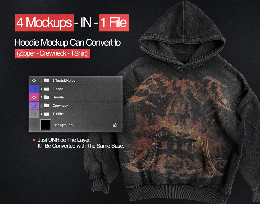 • 4-in-1 Mockup Styles (Zipper - Hoodie - Crewneck - TShirt)